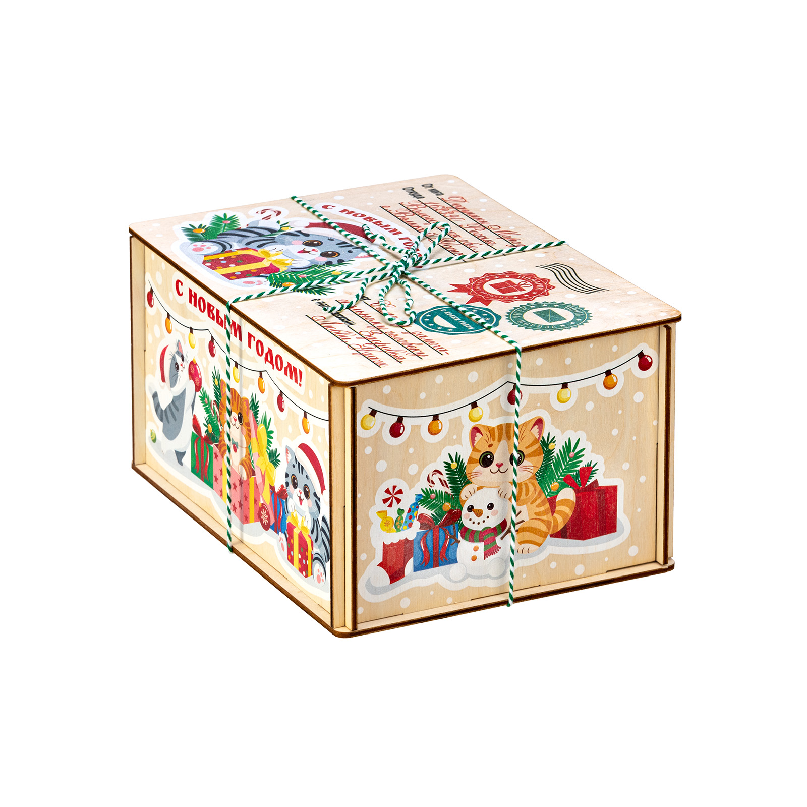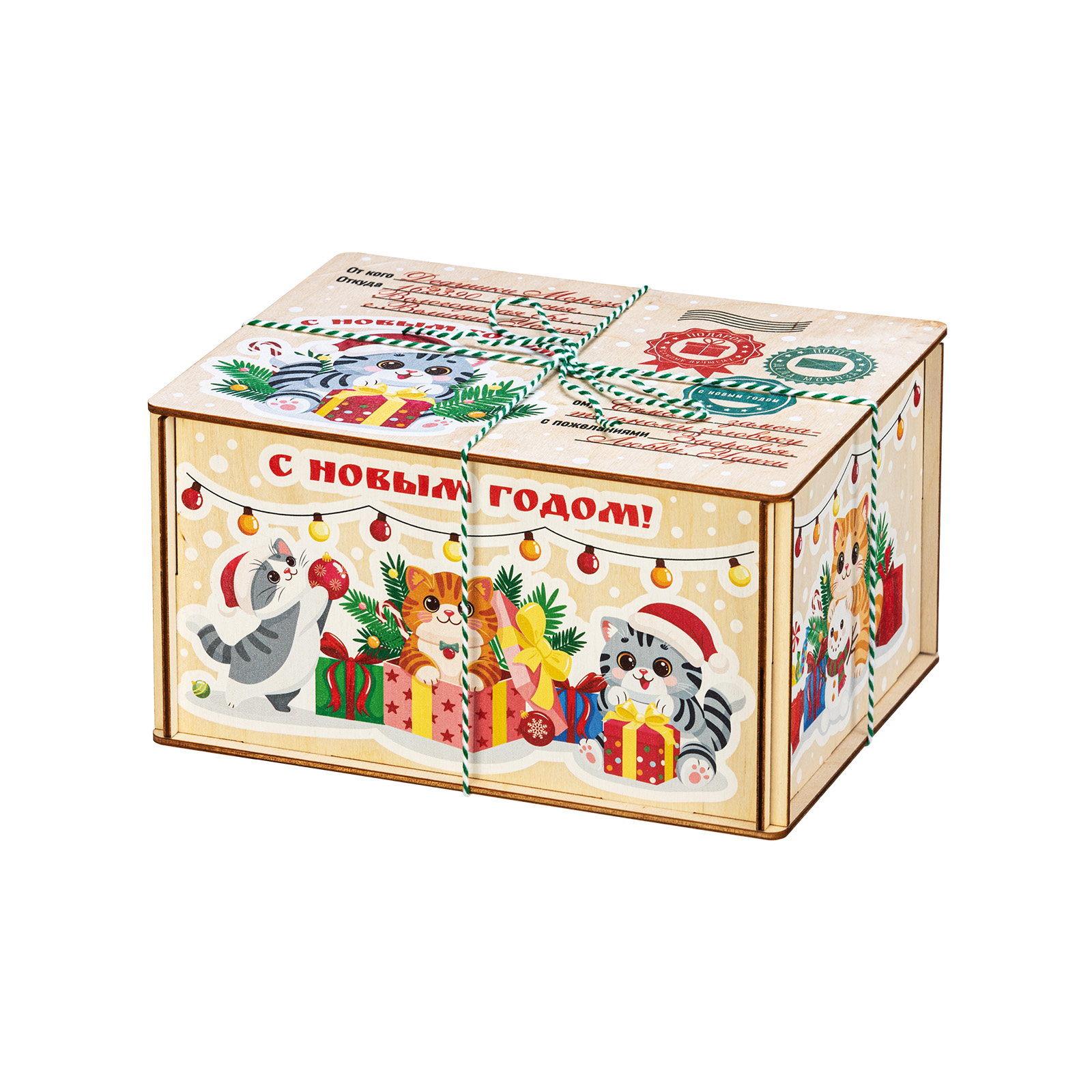 Новогодний сладкий подарок в деревянной упаковке - это сочетание практичности и оригинальности. За счет таких качеств подобные наборы подходят для дарения сластенам любого возраста. “Котики” - небольшой деревянный ящичек, оформленный под самую настоящую почтовую бандероль. Со всех сторон ящик украшен праздничными рисунками с милыми котятами, которые уже во всю готовятся отмечать Новый год. Но самое главное находится внутри - там бережно хранятся самые разнообразные лакомства для новогоднего стола. Здесь каждый сможет найти себе угощение по вкусу!