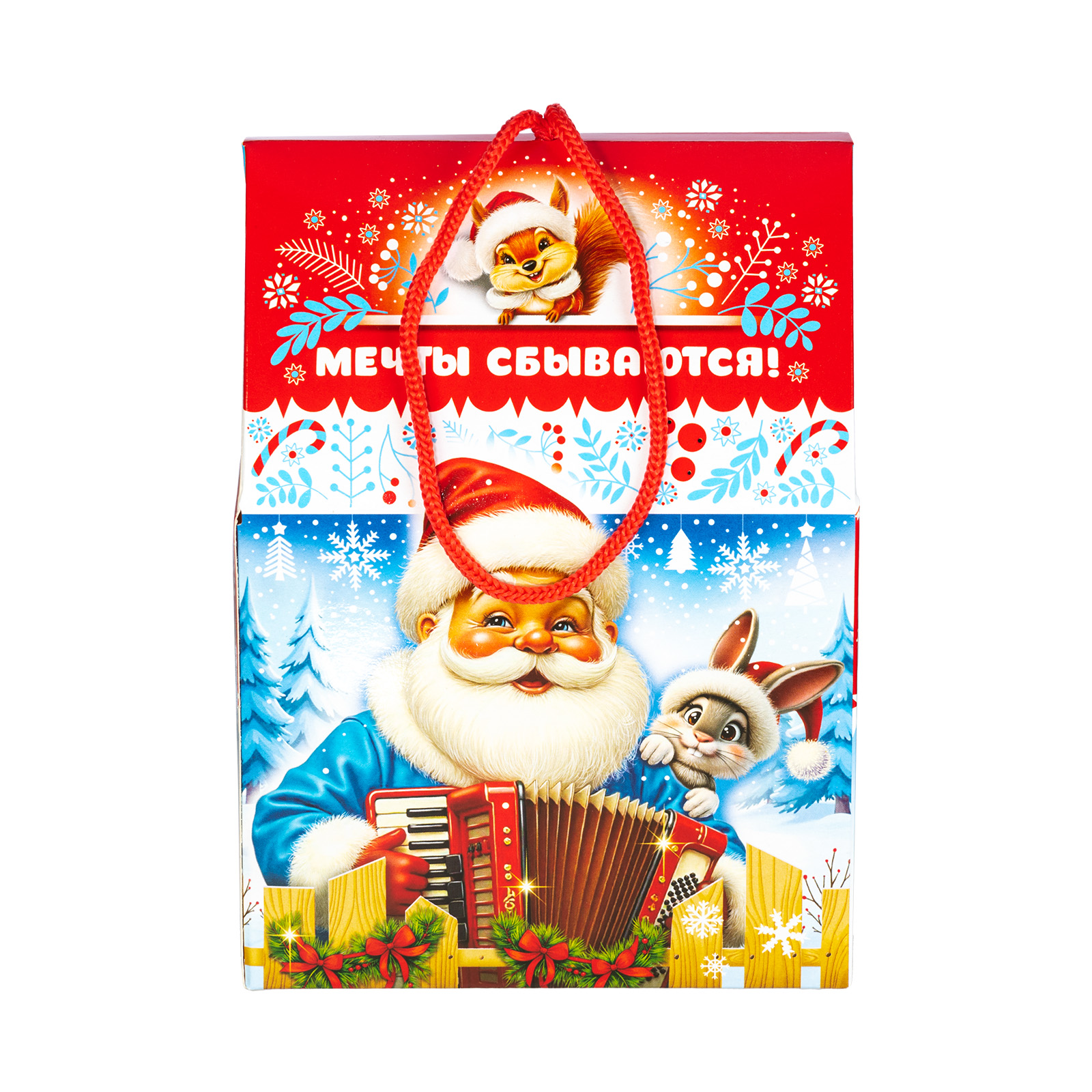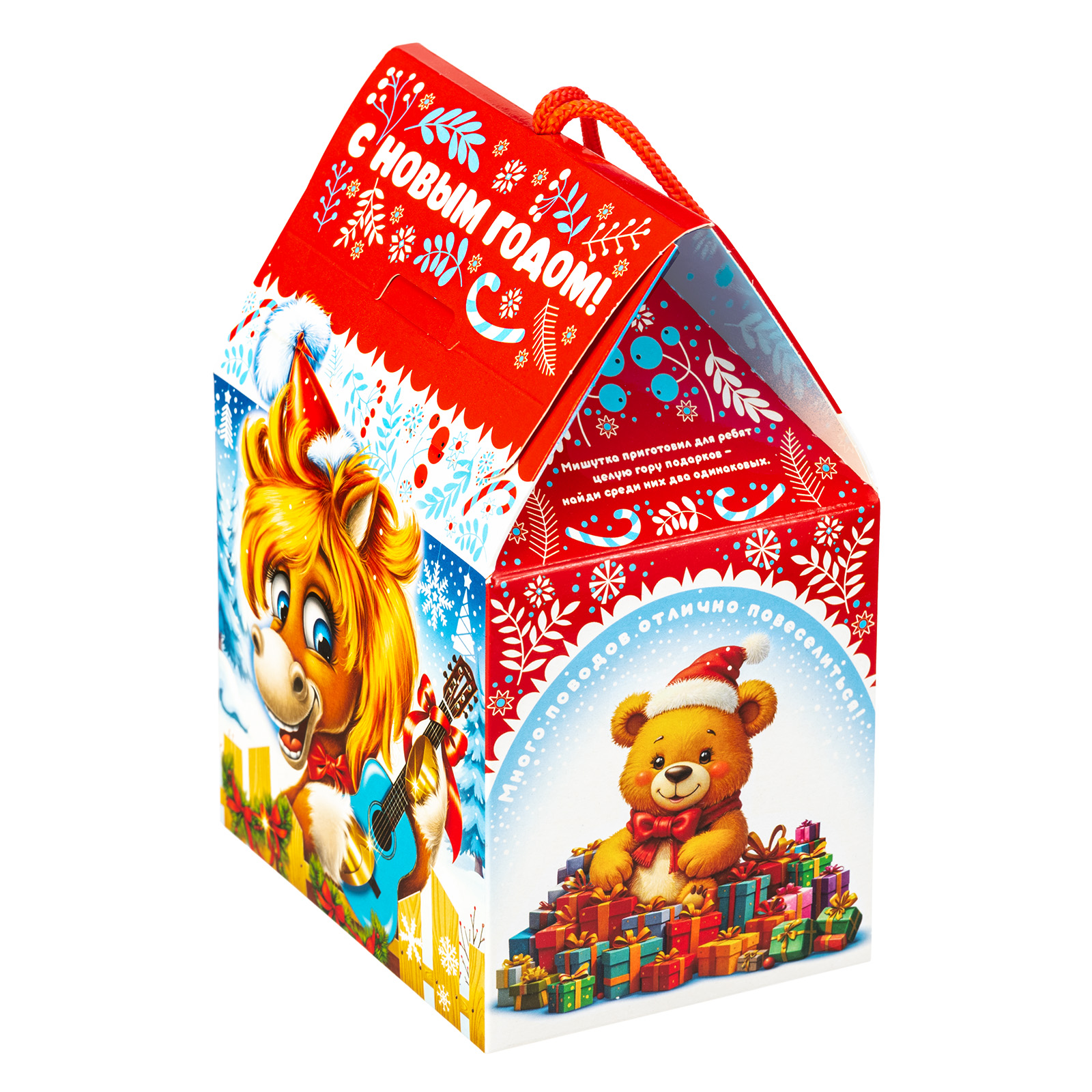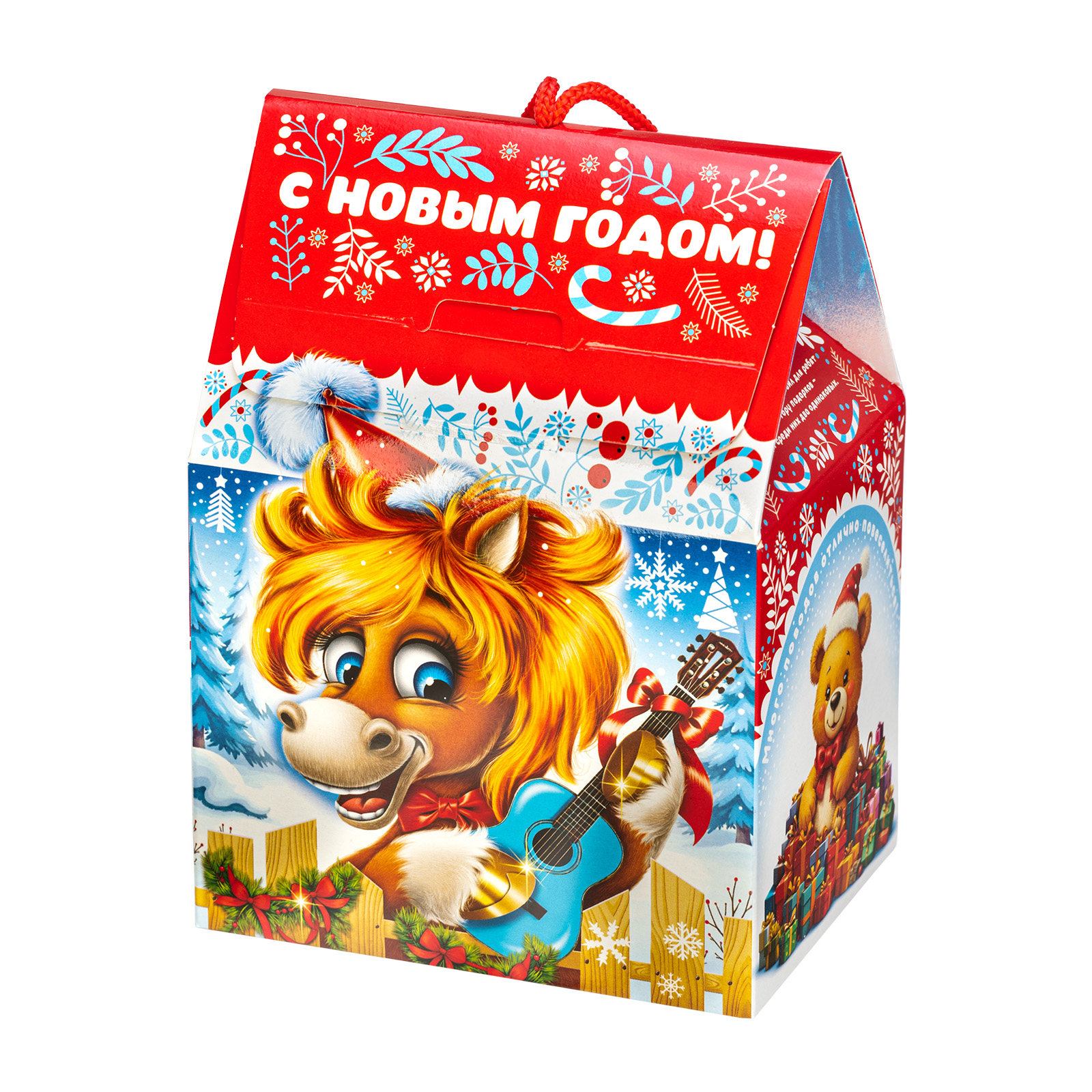 Этот компактный подарочный набор с удобной ручкой-шнурком идеально подходит для праздника в детском учреждении. Упаковка выполнена в сочетании ярко-красного цвета с различными холодными тонами, что придает ей привлекательности. На передной части мы видим забавную иллюстрацию с главным героем - веселым рыжим жеребцом Кешей, который держит в руках небольшую голубую гитару и, видимо, репетирует песню для новогоднего праздника. Внутри подарок также прекрасен: в его состав входит 600 грамм разнообразных лакомств и небольшой памятный сувенир, который еще долго будет напоминать всей вашей семье об этих замечательных праздниках.