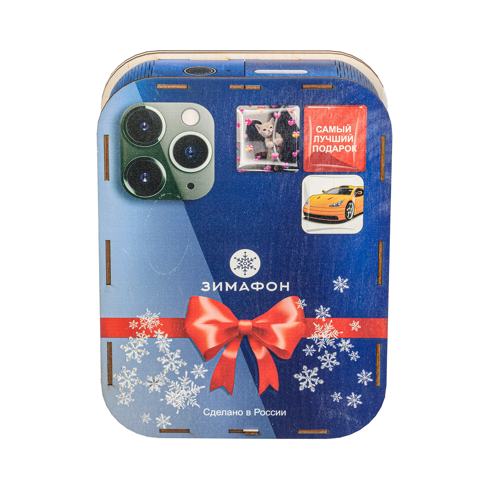 Современные дети настолько быстро развиваются, что порой их достаточно трудно удивить традиционными новогодними сладкими подарками. Именно для таких “продвинутых” сластен и был создан подарочный набор “Зимофон”. Это оригинальная деревянная коробочка, по форме оформлению максимально похожа на современный гаджет. На экране “Зимофона” мы видим Деда Мороза и Снегурочку, которые делают памятное фото с новогоднего праздника. Помимо хорошего разрешения камеры, данный смартфон обладает очень мощной памятью - в нем легко хранится целых 900 грамм вкусных и разнообразных сладостей, которых хватит на все новогодние праздники, а также небольшой памятный сувенир в виде символа наступающего года!